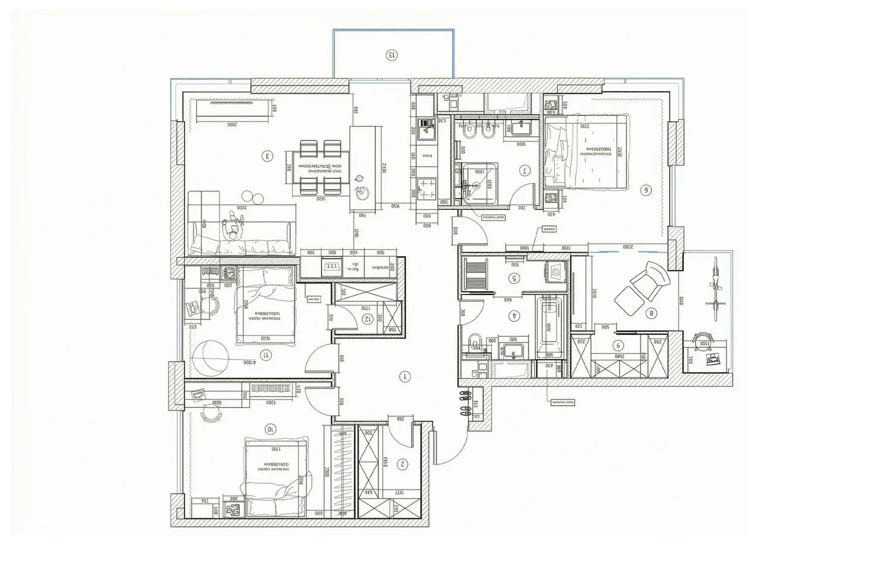 تخطيط بخيار واحد لترتيب الأثاث يراعي الجميع. الاستغناء عن الأرائك القماشية، وألواح الأسرّة المبطنة، والسجاد، وورق الجدران غير المنسوج، والشرائح الخشبية، والرخام البارز في حضوره. اختيار مواد تحمل صفة «إيكو» ومن دون عناصر تجمع الغبار. أبواب مخفية ووزرة مدمجة. نظام تهوية وتكييف لتنقية الهواء باستمرار. مطبخ «مذاب» في المنطقة العامة، مستلهم من أجواء مطبخ فيلم Nocturnal Animals. العمل مع لوحة داكنة وأسقف عالية ونوافذ بانورامية، بحيث يبقى التصميم الداخلي رصيناً لا كئيباً.