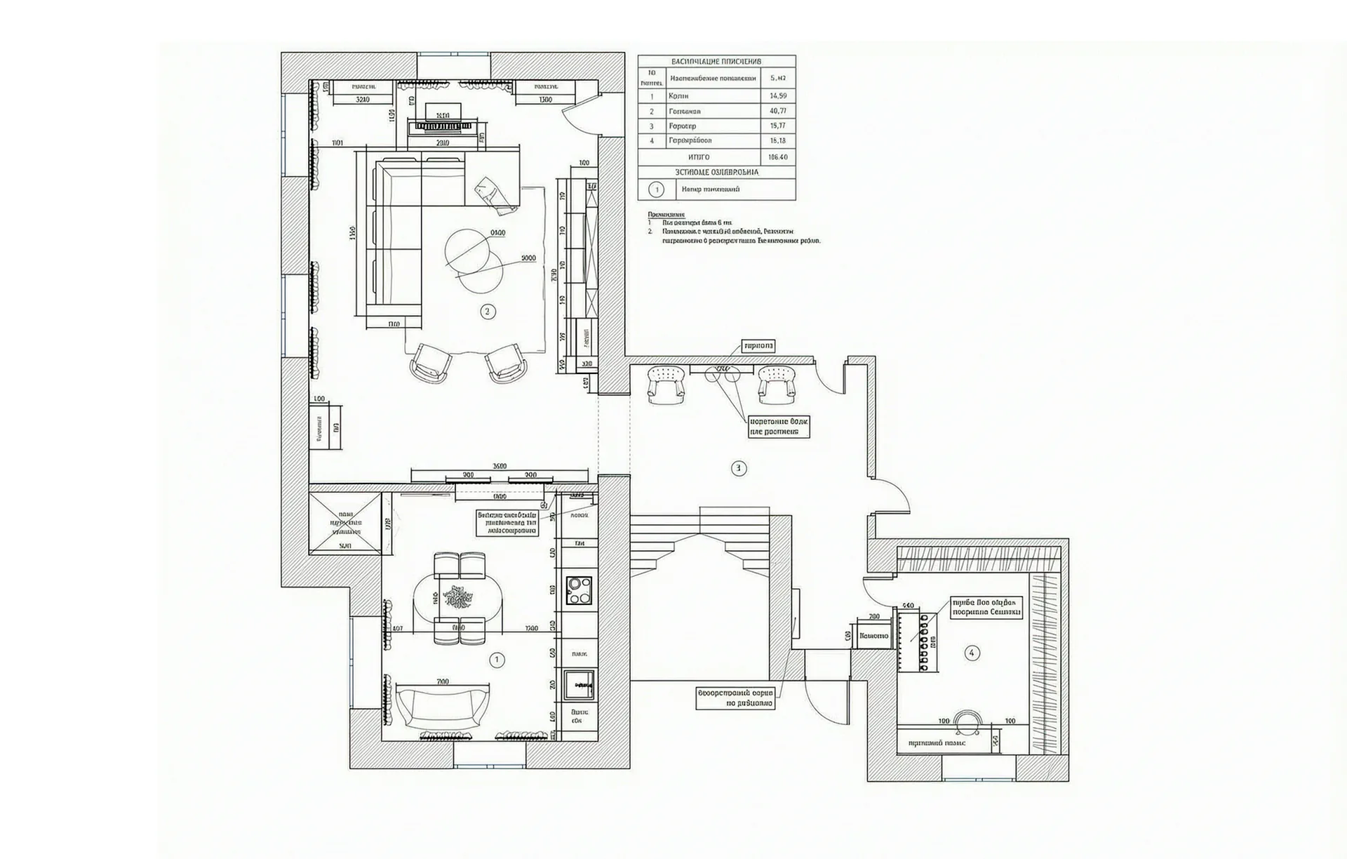 Complete change of concept and palette without replanning. Zoning of the first floor into a ceremonial hall with mirror and statement flooring, a fireplace lounge with sofas and armchairs, a piano area in the living room, and a kitchen-dining zone that can be screened with sliding partitions.